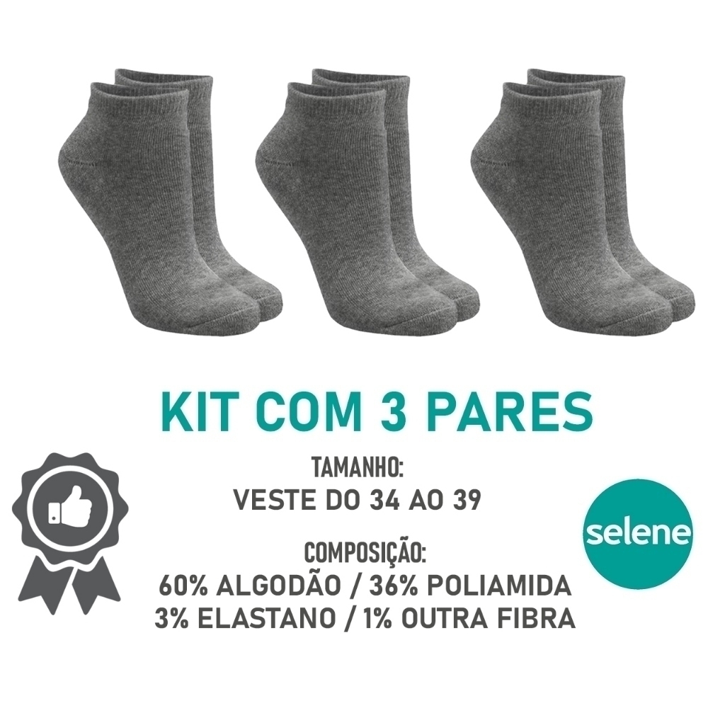 Kit 3 Pares de Meias Cano Curto Selene – Cinza Escuro (34 ao 39) Envio rápido - Produto em estoque. Conforto e praticidade em dose tripla! O kit contém 3 pares de meias cano curto Selene, todas na cor cinza escuro, ideais para uso no dia a dia ou em atividades esportivas. Tamanho: 34 ao 39 Cor: Cinza escuro Punho canelado: ajuste perfeito, sem apertar Interior atoalhado: maciez extra e absorção de impacto Marca: Selene (produto original) As meias Selene oferecem qualidade, durabilidade e conforto em cada detalhe, acompanhando você em todos os momentos.