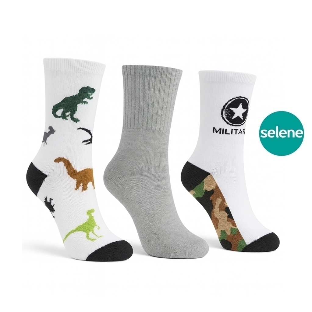 Diversão e conforto em cada passo! O kit contém 3 pares de meias infantis Selene, desenvolvidas especialmente para meninos, com estampas modernas e estilosas que acompanham todas as aventuras do dia a dia.