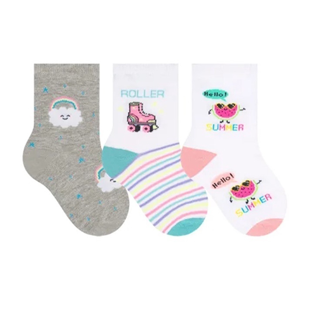 Kit com 3 pares de meias infantis cano médio, confortáveis e macias, com estampas femininas variadas. As peças possuem ótimo ajuste e toque agradável, ideais para o uso diário.